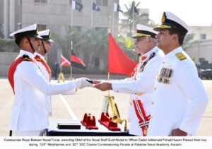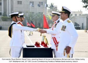 کراچی، 27 دسمبر25: 124ویں مڈشپ مین اور 32ویں شارٹ سروس کمیشن (ایس ایس سی) کورس کی کمیشننگ پریڈ پاکستان نیول اکیڈمی، کراچی میں منعقد ہوئی، جس میں 90 مڈشپ مین اور 34 ایس ایس سی کیڈٹس پاس آؤٹ ہوئے۔ کمانڈر رائل بحرین نیول فورس، ریئر ایڈمرل احمد محمد ابراہیم آل بن علی نے تقریب میں بطور مہمانِ خصوصی شرکت کی۔نیول اکیڈمی آمد پر مہمانِ خصوصی کا استقبال چیف آف دی نیول اسٹاف، ایڈمرل نوید اشرف نے کیا۔